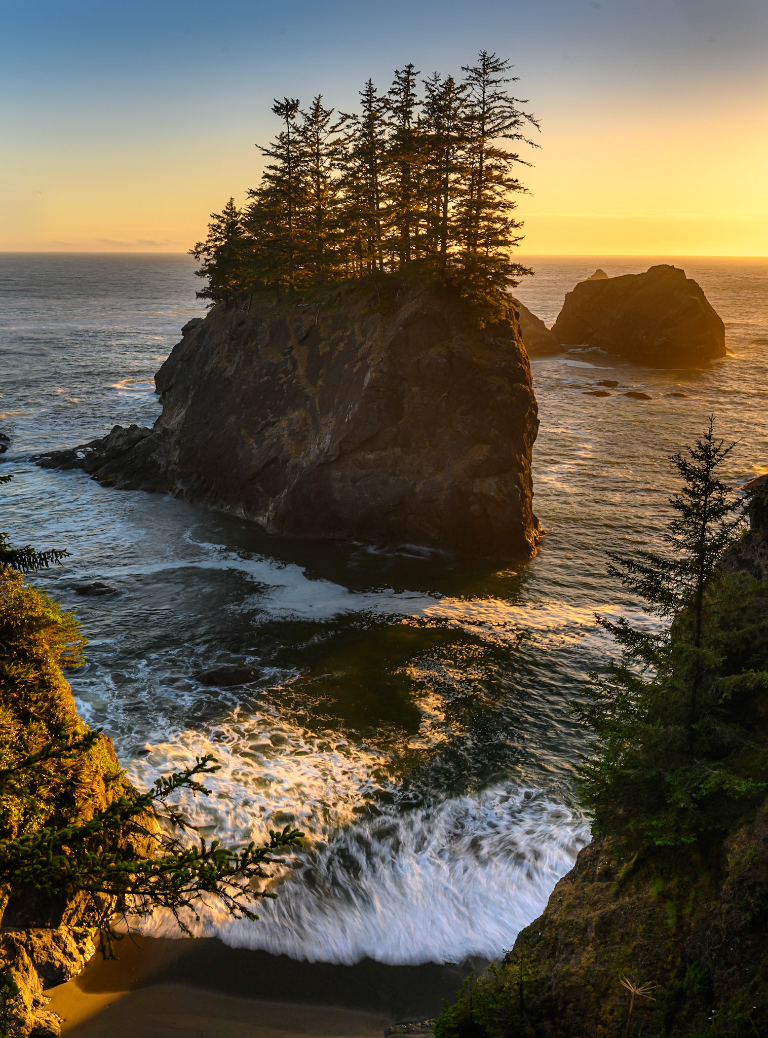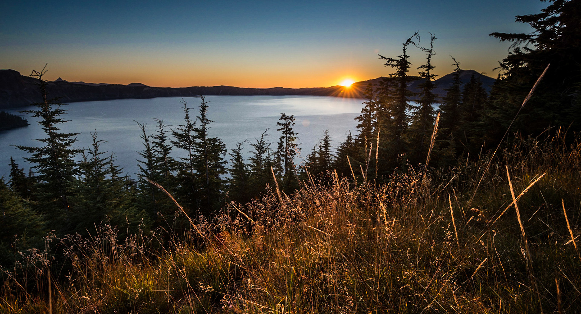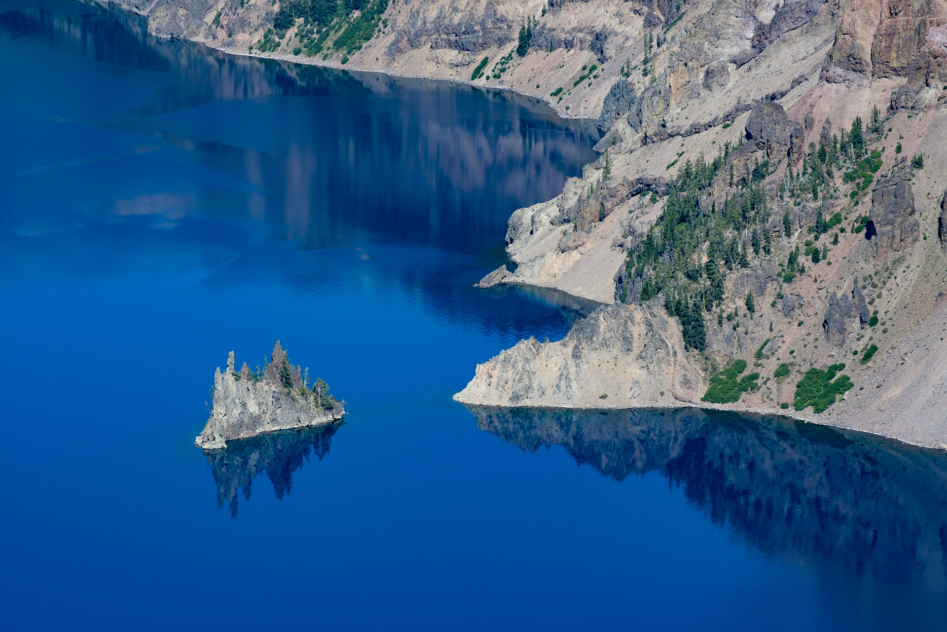 Wizard island peers through the trees in Crater Lake National Park, OR.