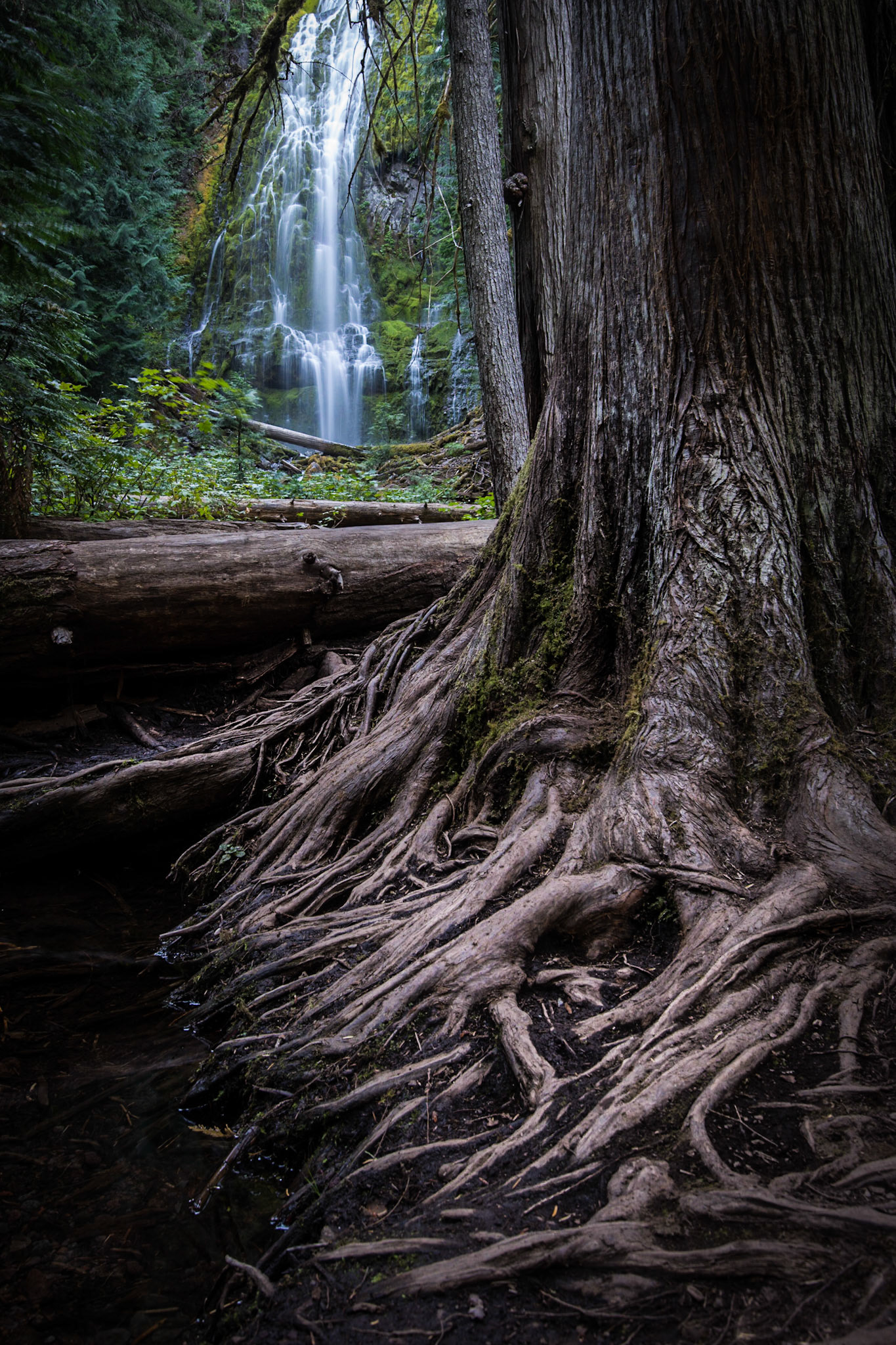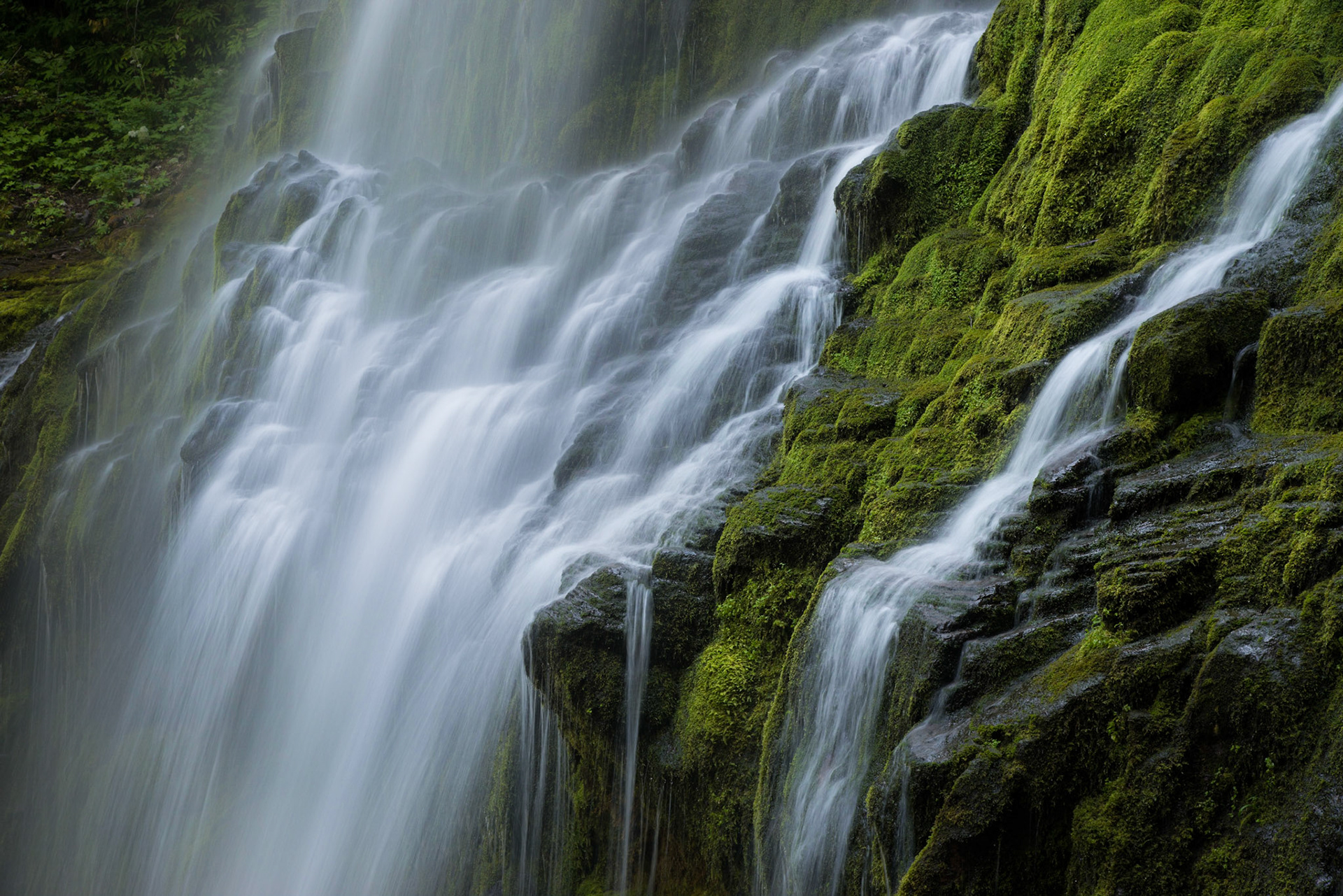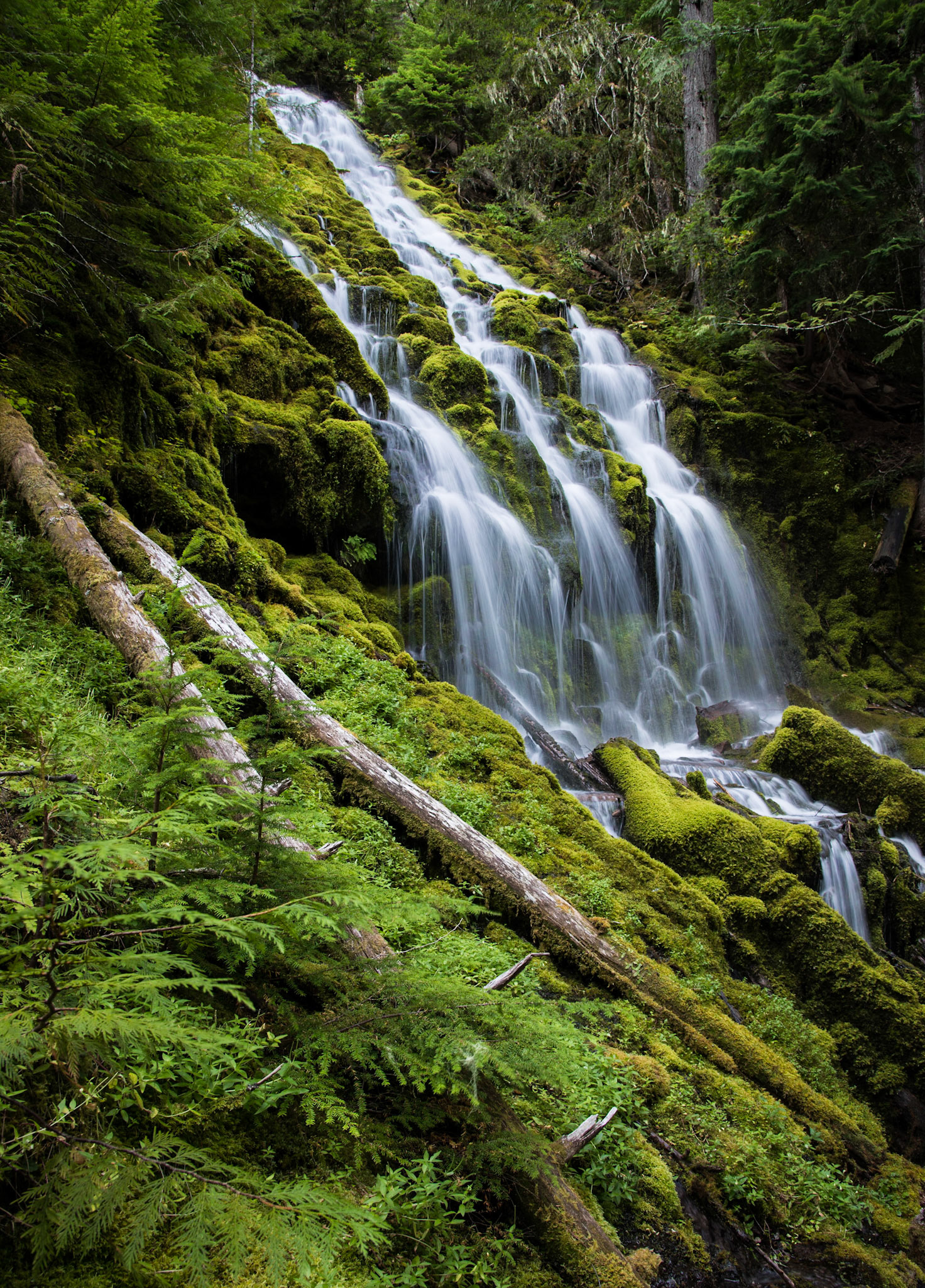 Proxy Falls cascades over mossy rocks in the Willamette National Forest, Oregon.